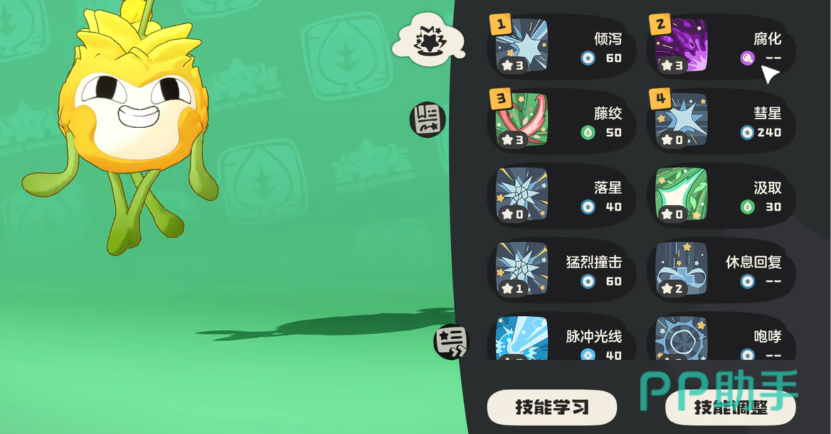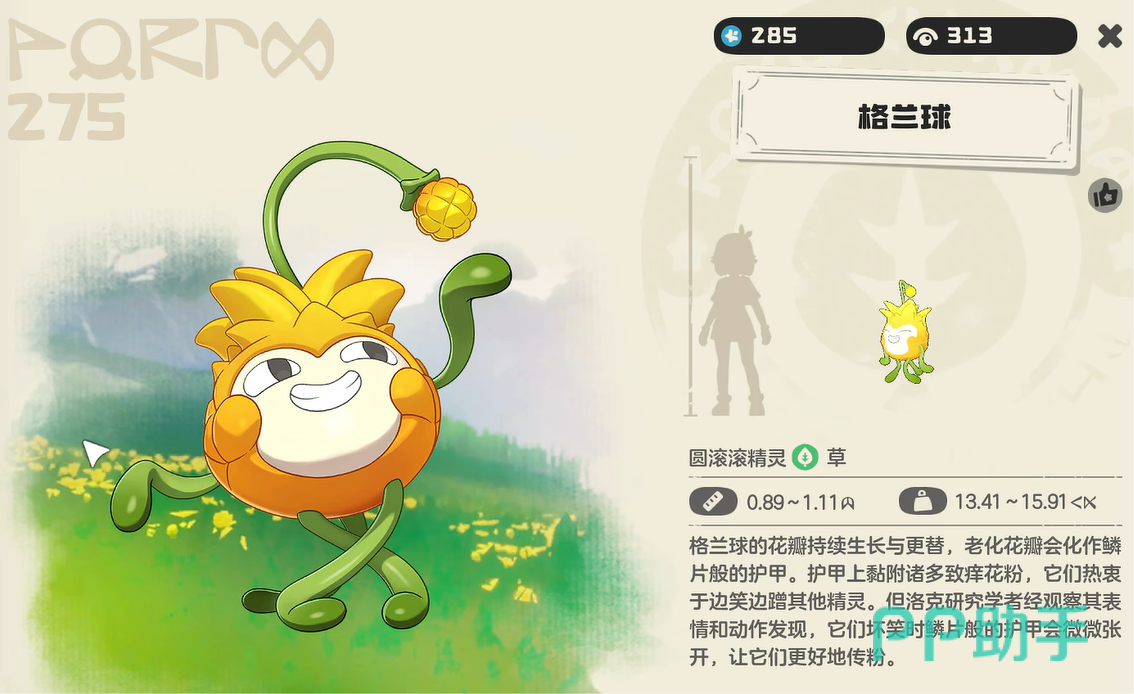 首先大家先来看一下它的外表,这是一个犹如球体形状的草系生物。他的表情非常夸张,不仅是眼珠子,还有笑脸,全都是特殊的圆弧状。然后不负大家众望,这是一个双草属性的精灵,所以也会更加克制土系的精灵,自身的天分也很高,性格比较孤僻。