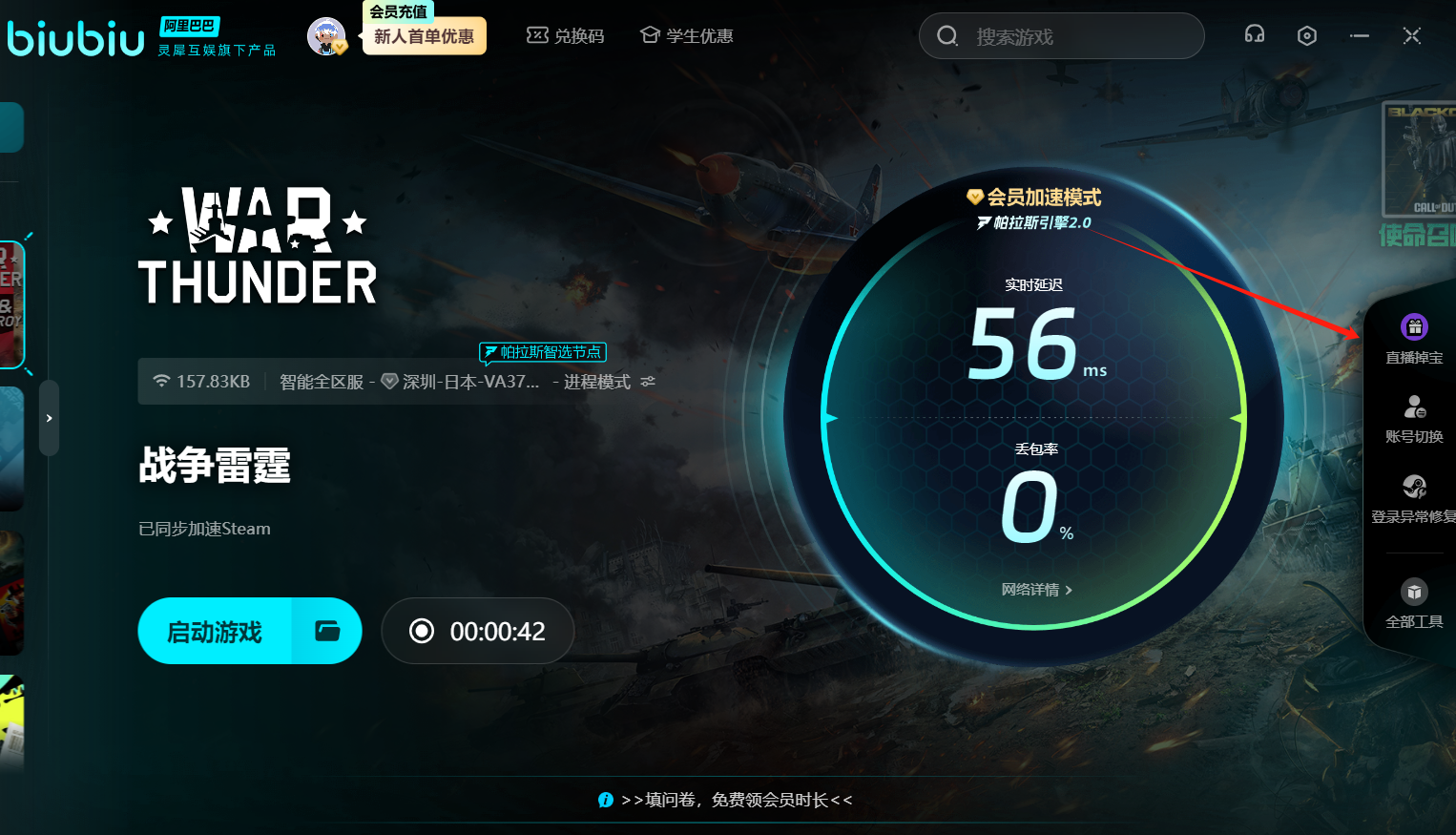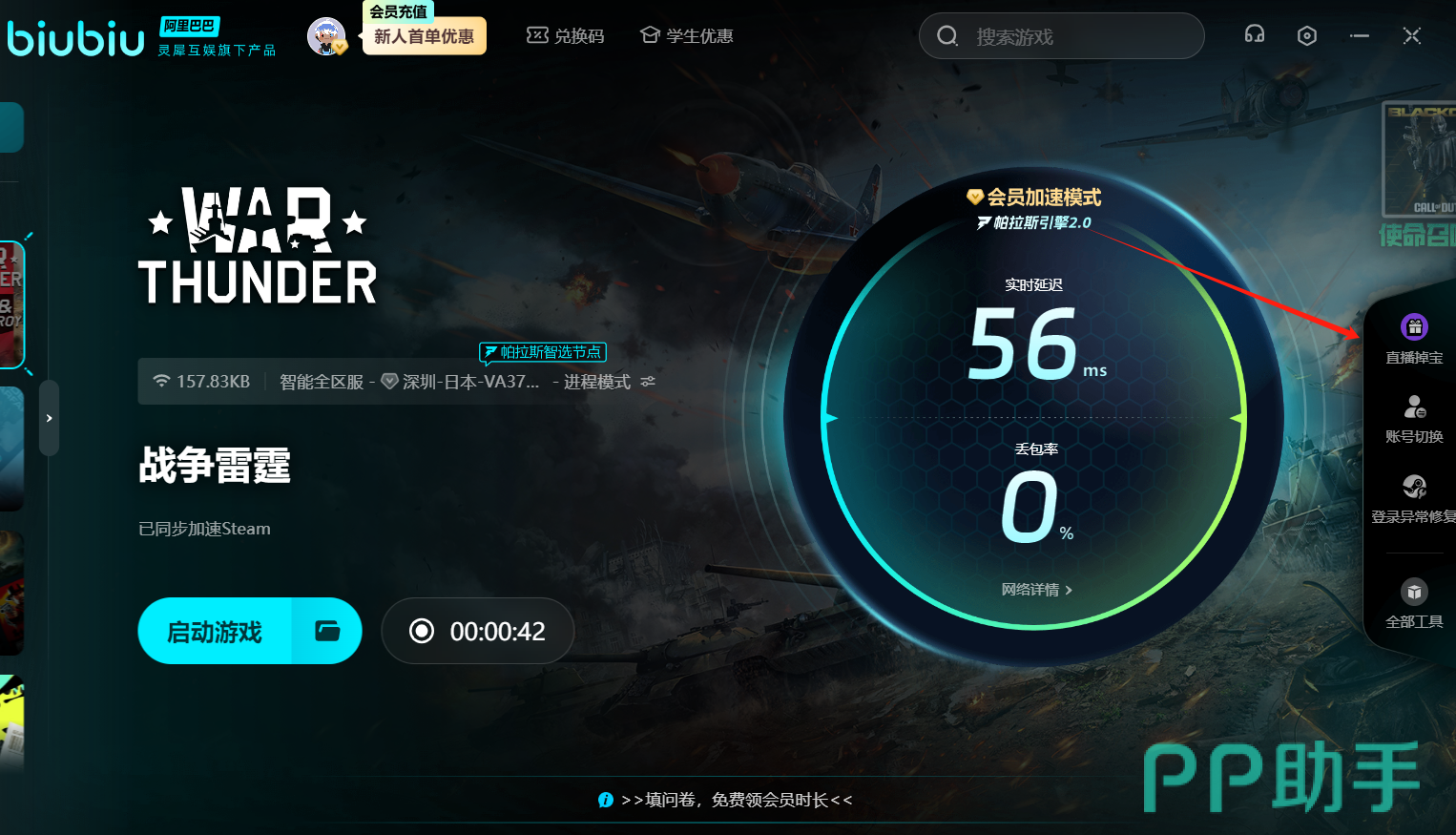 玩家可以使用biubiu加速器在右上角通过搜索就可以找到直播掉宝,在点击加速之后就会出现这一个页面。接着是登录游戏,在左上角的社区也能找到直播的按钮。