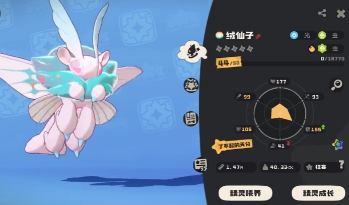 绒仙子最为突出的特性是垂怜,这一特性使速度能依据队伍中的精灵数量实现提升,队伍中不同种类的精灵越多,绒仙子的速度增幅就越显著,在一场6只不同种类精灵参战的团队战斗中,绒仙子通过垂怜特性获得的速度加成,能使速度数值超越原本速度较快的对手,从而在战斗中迅速展开行动,抢占先手优势,为己方队伍赢得有利的战斗节奏。