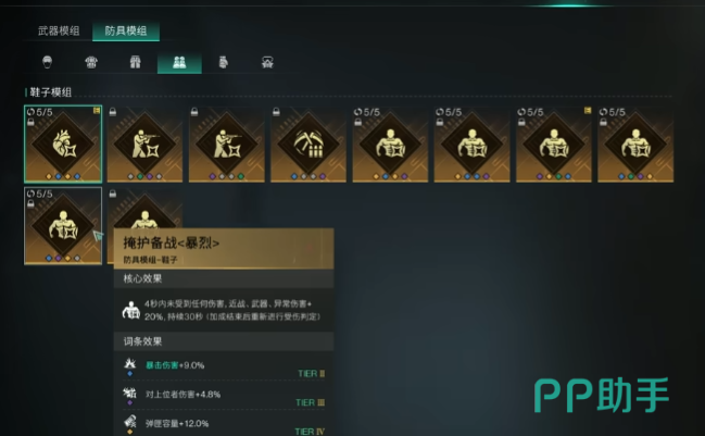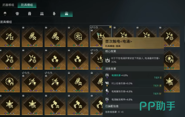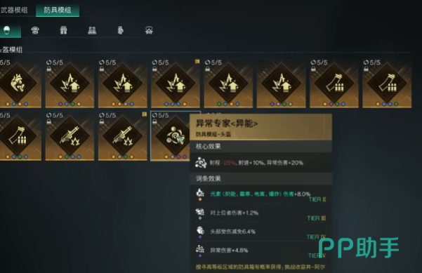 头部模组建议选择异常专家,提升射速和异常伤害,但会减少射程,配合速射图纸效果好,后期能让腐蚀在爆发时占尽优势,幸运牌手可加暴击率以及 暴击伤害,适合前期暴击率不足时弥补,对于腐蚀这把喷子,弱点伤害不太必要,暴击率和暴击伤害能带来非常大的收益,模组选择建议使用瞬态过载,可以在使用中缩短电涌异常的持续时间,同时还可以增加电涌伤害,让电涌触发频率更高,输出更稳定,若没有好的瞬态过载词条,可用蓝色模组或高频电泳过渡。