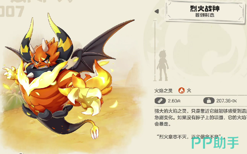 烈火战神在游戏当中,是一个火属性的核心输出角色,它需要从火神,亦或是火焰猿超进化而来。