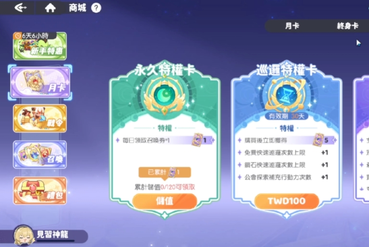 巡逻特权卡购买后立即获得5张召唤票,并增加挂机次数,对于以放置挂机为重要资源获取途径的游戏来说,增加挂机次数意味着能获取更多资源,是性价比极高的选择,基本属于必买项目,冒险特权卡可增加各资源本的挑战次数,在刷取经验药水、金币、装备材料等资源时,能获取更多收益,是刷资源本的必备特权,召唤永久卡购买后立即获得30抽,并且每天能领取5抽性价比极高,是获取召唤机会较为稳定且划算的方式。