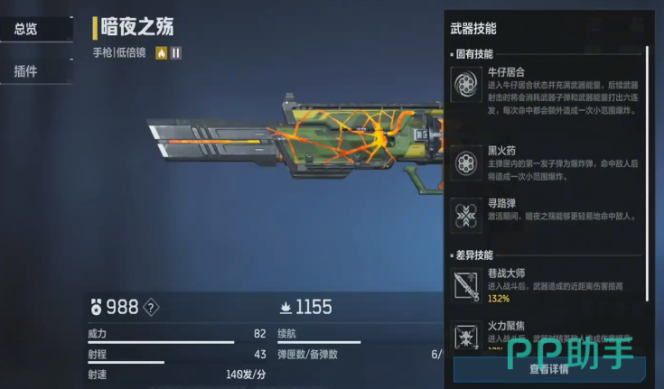 除了上面这些枪械之外,暗夜之殇也是比较推荐去使用的,看似这只是一把比较普通的手枪,但是这个枪械是有技能的,在游戏里可以使用黑火药这个固有技能形成一次小范围的爆炸,也可以选择用寻弹弹,更加轻松的击中对手,这个枪械的续航和威力也都比较厉害,玩家可以选择在最适合的时候使用这把枪械。