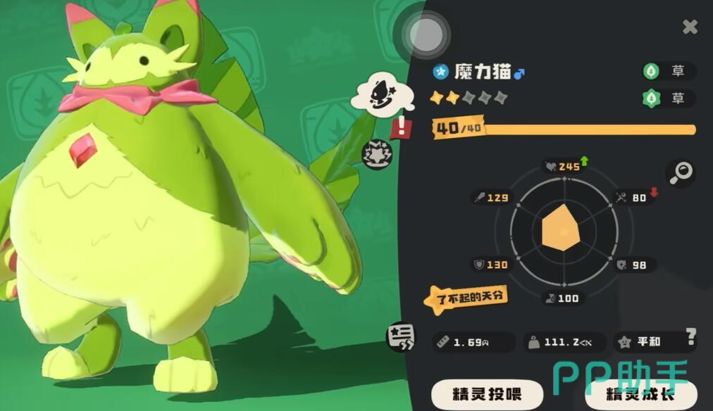 魔力喵种族值总和为606,物理防御(109)与精力(生命值)较为突出,魔法攻击(88)相对薄弱,定位偏向物理抗伤与消耗型辅助。氧循环与技能光合作用可以联动每回合回复生命并叠加光合印记,建议优先提升物防与精力属性,增强战场存活率。性格推荐沉着(加魔防)或大胆(加物防),天赋优先物防、精力与魔抗。