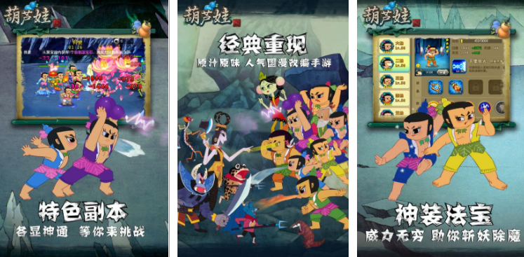 熟悉葫芦娃的都知道,在葫芦山下关押着蛇精和蝎子精,被穿山甲打洞,导致这两个妖魔趁机逃出了葫芦山的关押,这个葫芦娃受到爷爷的照料得以重新出世,在这个游戏里,玩家扮演的就是葫芦娃的形象,可以操控这些角色各展神通,每一次战斗都有华丽的特效,可以通过团队之间的互相协作,挑战上百个不同的关卡。