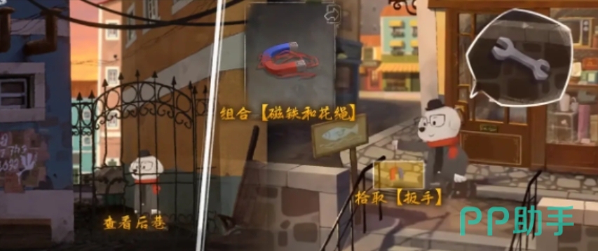 接着跟随指引来到旧城区,在墙壁顶端可以获得集卡4。拾取桌上的玻璃和螺丝刀,用螺丝刀打开箱子,可以获得花绳、扳手、磁铁,利用这些道具就可以上到后巷屋顶。然后将电源关闭,拿走灯泡,利用灯泡引走在剧院门口的小孩。然后赶紧回到小狗身边,对话后获得一把钥匙再返回剧院,打开剧院大门,就可以找到剧院经理告知事情经过,第二章就结束了。