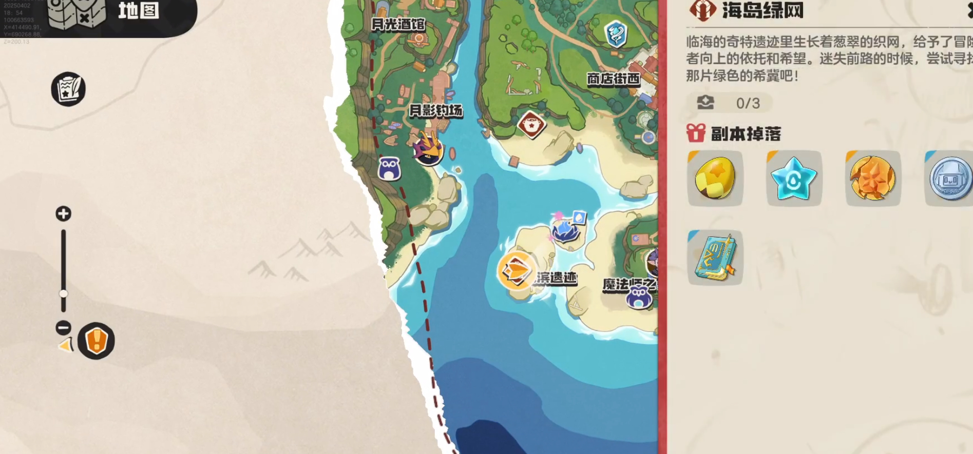 海岛绿网的位置在魔法师之家左边的湖滨遗迹地图上,找到之后传送过去会见到一个蓝色的入口。海岛绿网是一个特定的探索区域,玩家需要去海岛绿网秘境中寻找恩佐研究神秘魔法的真相。海岛绿网每周有三次探索机会,探索完成之后可以获得洛克贝,精灵蛋和宝典等资源奖励。