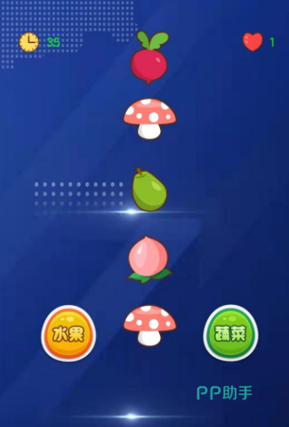 这是一款轻松又益智的闯关小游戏。它运用了色彩缤纷的卡通风格画面,玩家要在限定时间里,迅速分辨出屏幕上闪现的各种水果和蔬菜,并将它们正确归类。随着一关关地推进,玩家既能锻炼自己的反应速度,又能学到不少新知识。游戏的难度会循序渐进地增加,每一关都有不一样的趣味体验。再加上那活泼欢快的背景音乐,能让玩家完全沉浸在轻松愉悦的环境里,尽情享受游戏的快乐。