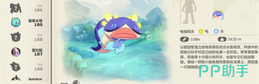 闪电鳗鱼在游戏中也哭通过精灵种子获取,不过获取的是闪电鳗鱼的初始状态。目前在游戏中闪电鳗鱼的最初模样都是初始,需要玩家在后期培养进化就能成为闪电鳗鱼了。闪电鳗鱼拥有水、电、武,各项数值。