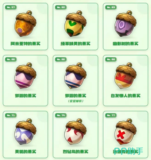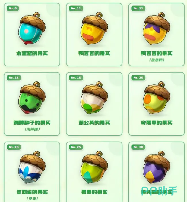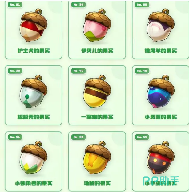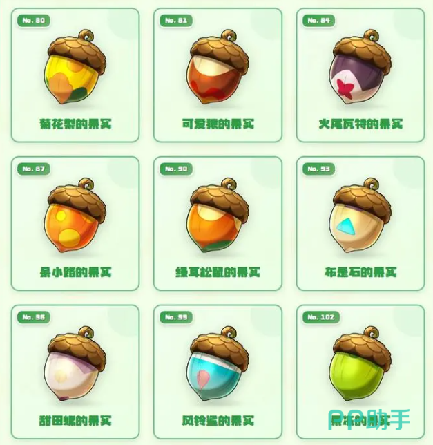 其他果实还包含有水蓝蓝果实、鸭吉吉果实、鸭绒容果实、蒲公英果实等等,这些果实的初始形态都为草属性,并且在进化之后,会附加有一定的草系技能效果。