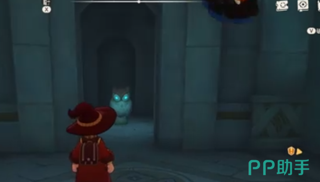 玩家首先要先来风眠圣所到第一个机关这里,先飞到任意一侧平台上面,使用星星魔法棒去攻击猫头鹰,打完猫头鹰后,我们在飞到对面平台上去,在对面平台这里还有只猫头鹰,继续攻击对面平台的猫头鹰,两侧的猫头鹰都打完后,飞回中间的台子上面,等待一下就能看到两边会出现个红格子机关。