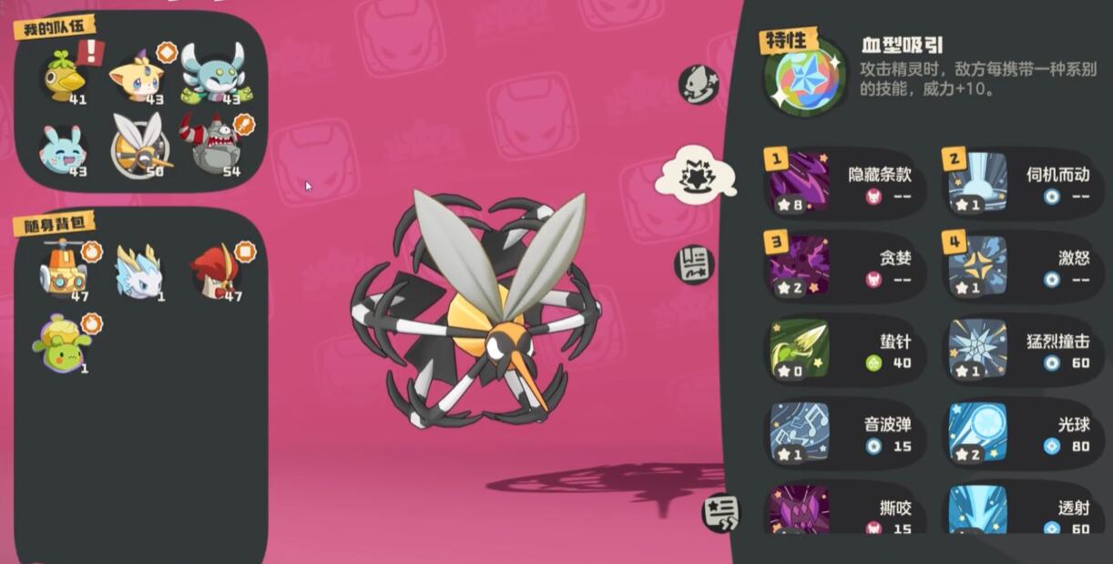 窃光蚊适合搭配控场型队友与高爆发输出(如皇家狮鹫)。主流阵容为窃光蚊+雪灵+幻灵菇,这样可以累加它的被动威力。需规避毒系(如蹦蹦种子)与岩系(如遁鼠)阵容,前者可免疫中毒效果,后者凭借高防御抵消能耗压制。对抗速攻流时要带提升威力的技能争取秒杀c位。