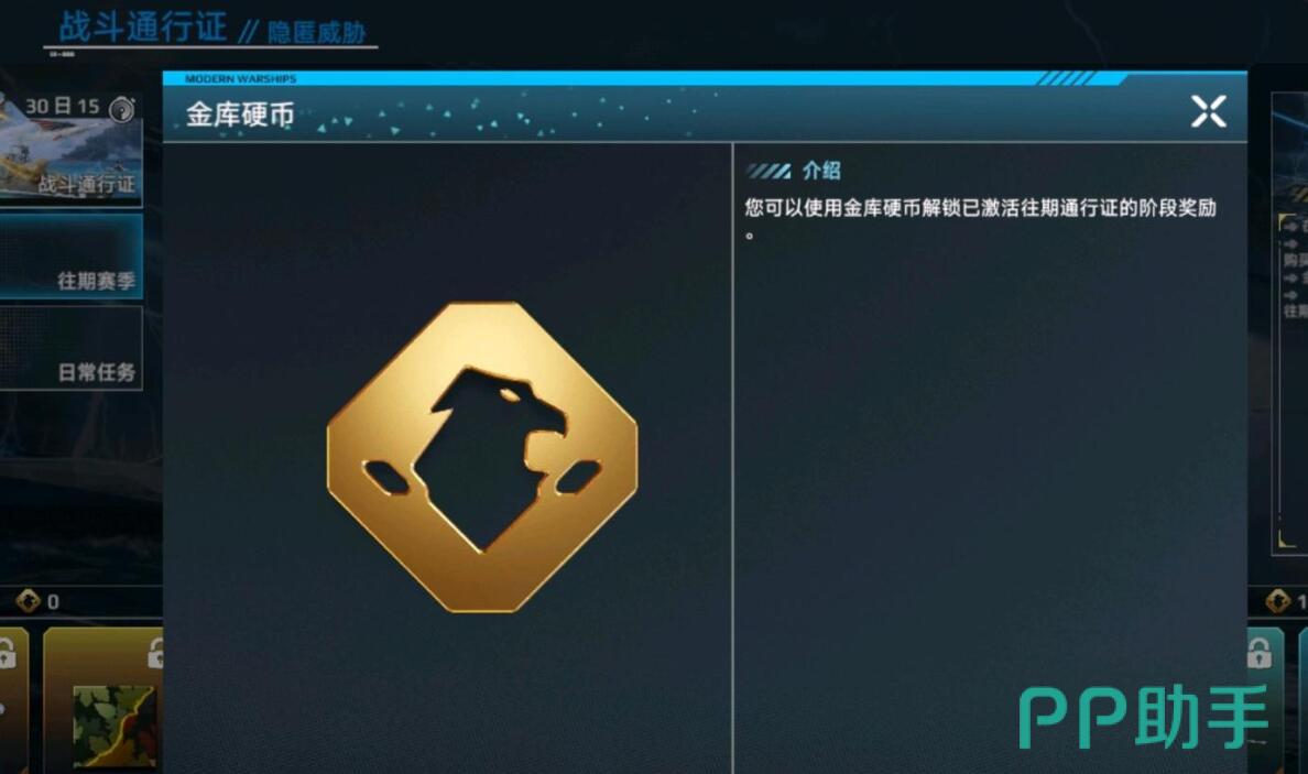 金库硬币主要用于解锁往期通行证奖励,包括限定舰船、武器涂装、稀有装备等,玩家若错过某赛季的“暴风战斗机”、“096核潜艇”等等,可通过消耗硬币重新激活该赛季战令并逐级解锁奖励。兑换时需注意:每期战令需单独购买解锁权限,硬币仅用于兑换已解锁战令内的具体奖励层级。