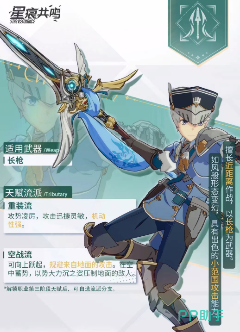 空战流属于青岚骑士,这个角色在游戏里是一个攻击类型的职业,但同时也具有一定的防御力,属于一个攻守兼备的角色,角色可以适应多个不同的战斗环境,对战的时候会用长枪进行战斗,虽然用的是长枪,但是比较擅长近距离作战,在后期会根据角色不同的流派,产生出不同的战斗能力。