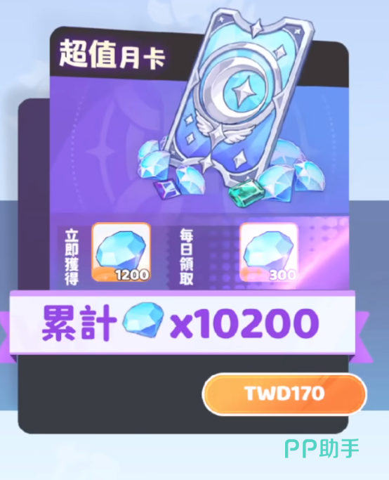 首先大家先来看一下超值月卡,也就是最低档次的月卡。你只需要花费170块,就可以立即获得1200个钻石,另外每天都可以领取300个钻石。也就是说,全部累积下来可以获得10200钻石。这对于一个萌新来说,无疑是久旱逢甘霖。