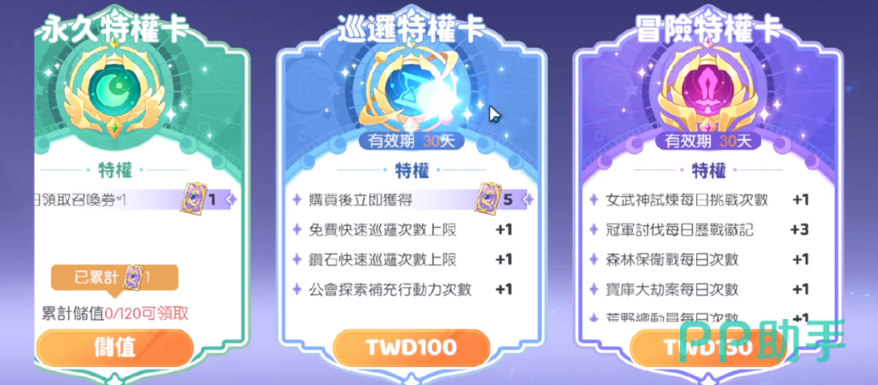 然后还有一些限时的特权卡,从某个意义来说也算是月卡,因为每次购买之后可以生效一个月。例如巡逻特权卡,购买之后可以立即获得5张抽奖券,并且每天都可以获得一次巡逻次数,以及快速巡逻次数,并且在探索公会时可以获得一次的补充行动机会。