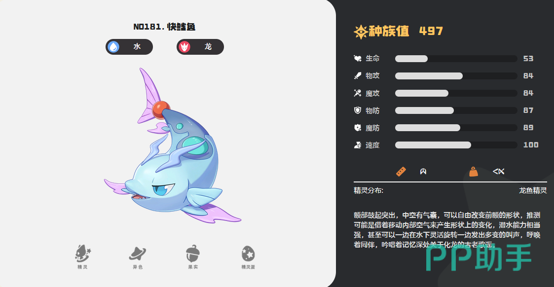 快鳍鱼是属于游戏中的水系宠物,它的额部鼓起突出,里面有气囊,潜水能力很强。种族值为497,生命53、物攻84、魔攻84、物防87、魔防89、速度、100。它的特性是洄游,在蓄力时,技能消耗能降低两点。因为该精灵的技能比较多,所以小编挑选一些比较重要的给大家进行介绍。第1个是激怒,敌方除了本回合释放的技能,其他技能消耗增加4点。第2个天旋地转,造成物理伤害,先手加1点,迸发,威力增加30。