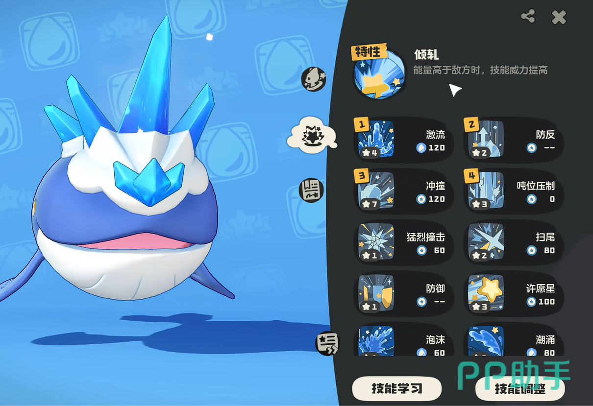 深蓝鲸一经捕捉之后就会提升至32级,它的特性叫做倾轧,当自己的能量高于对方时,可以大幅度提升技能威力。所以这是一个可以恃强凌弱的存在,面对弱小时爆发伤害更高。技能方面都偏向于水属性,伤害也会更高,然后也带有一些防御技能。