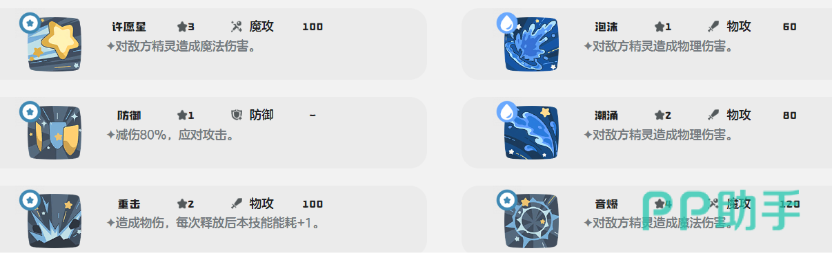 技能方面的话,更加推荐大家搭配泡沫,这招可以直接造成高额物理伤害,是主要输出技能。另外还要学习潮涌,同样是一个物理伤害技能,可以造成更多输出。另外还建议学习防御,可以直接减少百80%伤害,足以应对高爆发伤害。