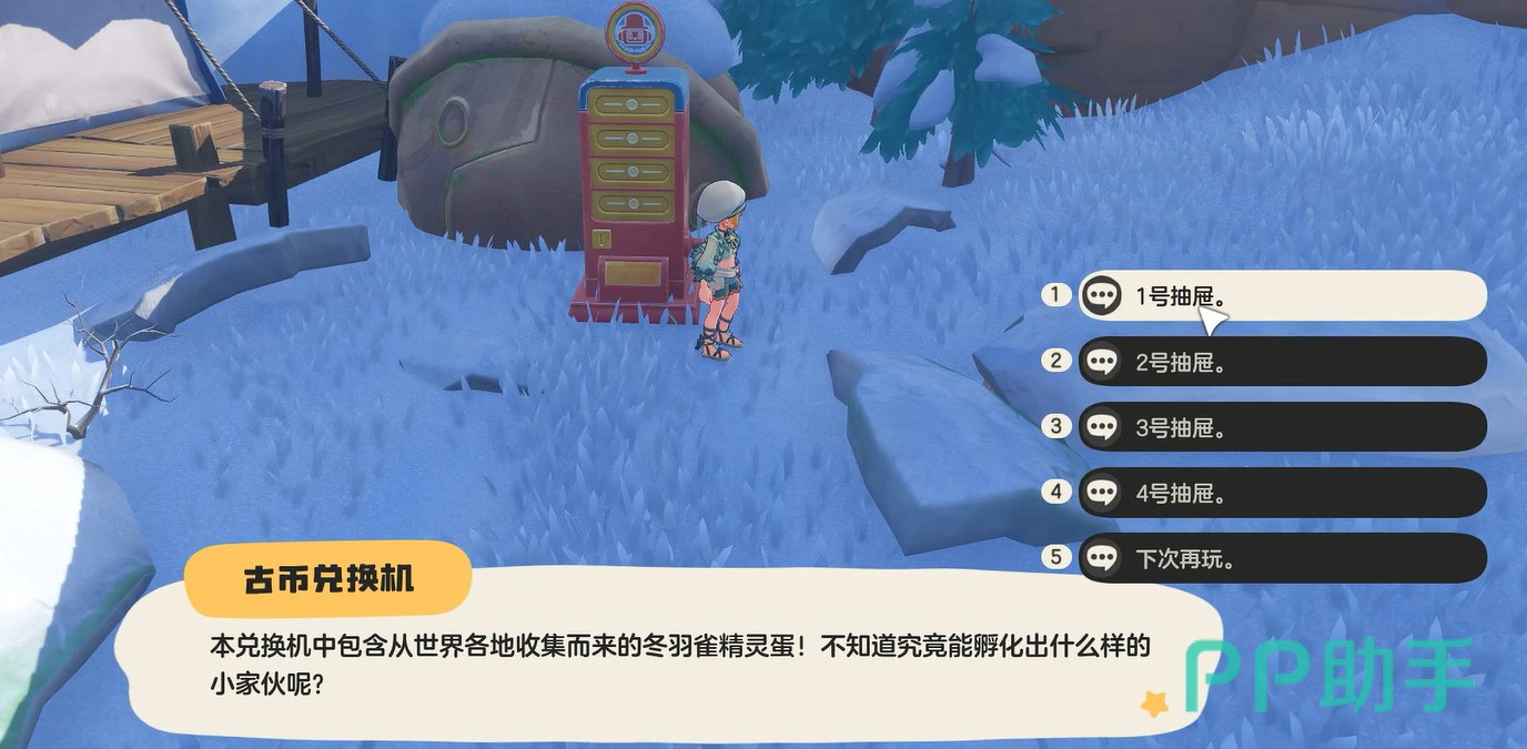 获取之后只需要在旁边的抽奖台上进行抽奖即可,每次抽奖都需要花费一枚游戏币。头奖的话那自然就是雪绒鸟蛋了,然后兑换机中包含从世界各地收集而来的冬羽雀精灵蛋!这就说明大家有可能抽不同的鸟蛋,分别为春夏秋冬,很值得大家拥有。