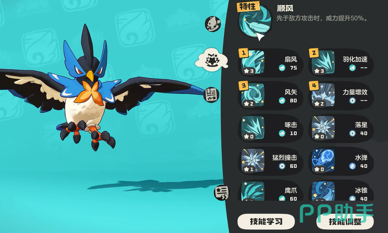 雪绒鸟可以进化成岚鸟,技能配招方面推荐用扇风,可以造成范围风属性伤害。然后还有羽化加速,可以更快移动并输出。然后再加上力量增效,就可以获得更高的物攻加成,再加上风矢,输出技能更多。