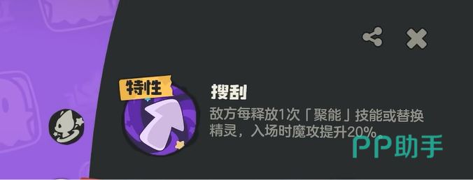 另外它的特性叫做搜刮,顾名思义当对方替换角色或者释放技能时,就可以直接提升20%点的魔法攻击力。让他愈战愈勇,这也跟他的幽灵属性非常契合。所以面对技能释放得特别频繁的对手时,他所展现出来的伤害也会变得越来越高。