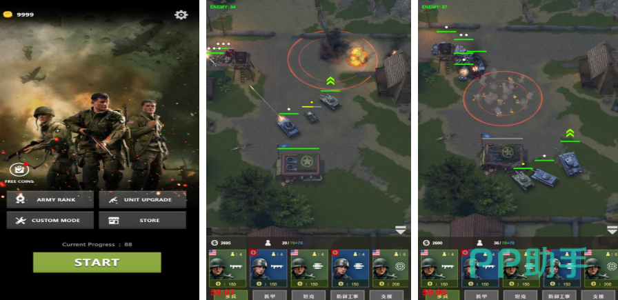 在战争TD策略游戏中,精心打造了多样的二战场景,从欧洲战场的城市巷战,到太平洋战场的岛屿攻防,再到北非沙漠的装甲对决,每一处场景都依据真实历史资料构建,城市中残垣断壁的建筑、沙漠里起伏的沙丘、岛屿上茂密的丛林,都栩栩如生地呈现,高度还原了历史上惊心动魄的战役,让玩家仿佛置身于二战的真实战场。