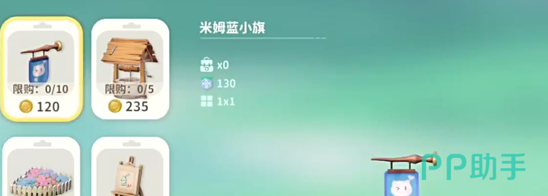 除了这个之外,在这里还可以买到米姆蓝小旗。这只是一个简单的旗帜,而且在旗帜上绘制出一只白色的小熊,特别可爱。然后还可以买到木顶水井,是一个能够遮风挡雨的水井,在这里能够让你的米姆打到更多的水,方便日常用来浇花。