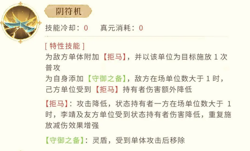 说到【拒马】,这可不只是李靖用来单纯攻击敌人的工具,它还是他整个战斗策略的核心之一。李靖的“阴符机”技能会为敌方附加【拒马】状态,简单来说就是让敌人的攻击力减弱。与此同时,他还能够为自己加上【守御之备】,为自己披上了坚固的防御盾牌,这个盾牌会在受到单体攻击时移除,但有一个关键点——如果敌人有不止一个单位存在,【拒马】的减伤效果就会越来越强。这就意味着,李靖的防守不仅仅是单一的盾牌,而是一个层层递进的防御网,越是敌人数量多,李靖和队友的保护就越强。
