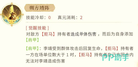 当局势变得更加复杂时,李靖的觉醒技能【朔方靖阵】便展现出了他无与伦比的控制力。在敌人持有【拒马】的情况下,李靖会施放强力的单体攻击,并为自己添加【肩甲】。这个【肩甲】真实的效果是:李靖在受到群体攻击时,会有生命恢复的效果。而且,如果敌人持有【拒马】的单位数量超过1,李靖还会在己方回合内使敌人无法对自己造成伤害。这种技能不仅大幅度提升了李靖的生存能力,还能有效牵制敌人的攻击节奏,配合队友打出反击的机会。