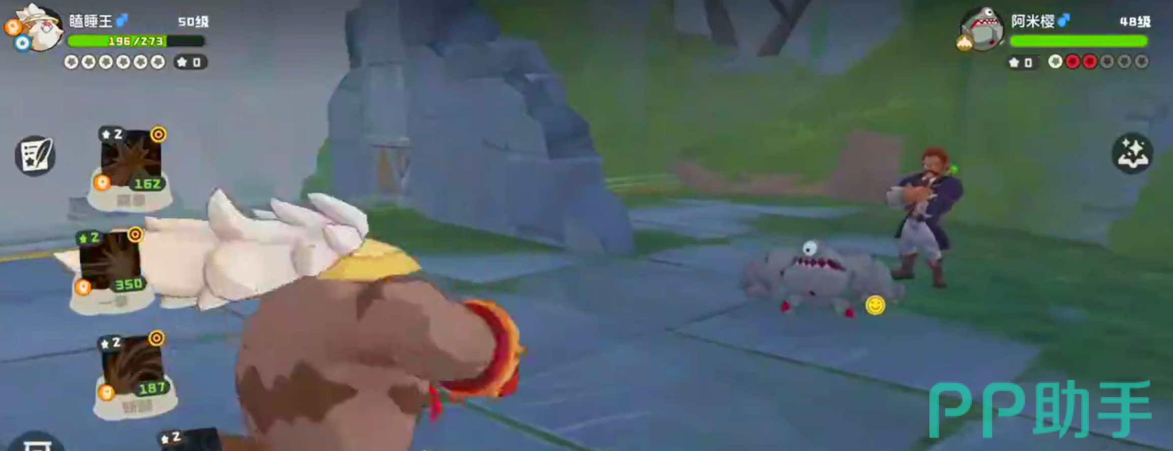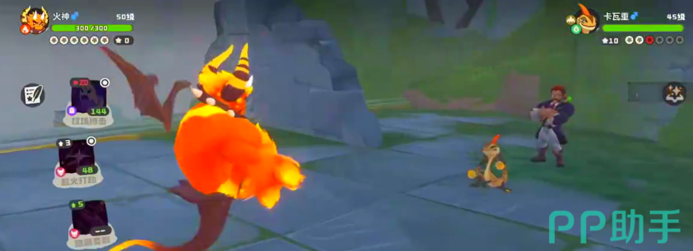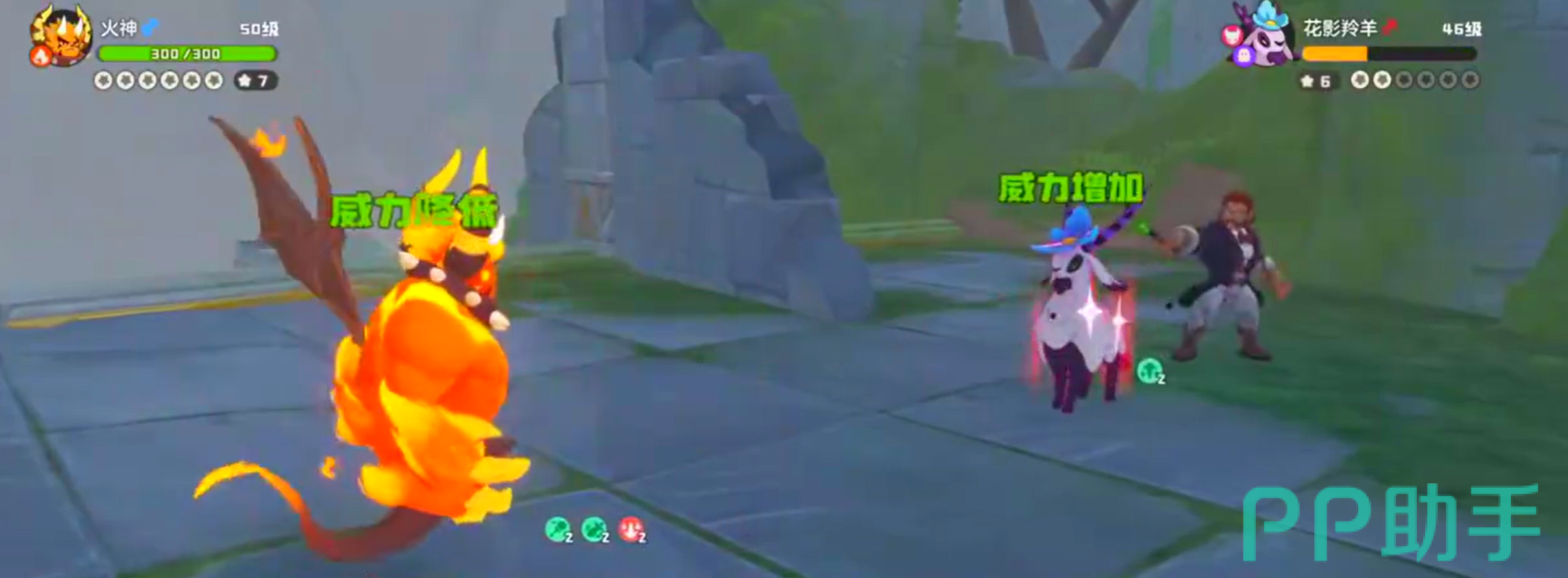 击败两个精灵后进入到二阶段,打法和上述区别不大,但是精灵的属性则拥有双重特性。开局的花影羚羊双系能力加身后,这里需要注意花影羚羊在受伤后会触发限定技能隐藏条款,可以让双方的技能组调换。但它本体的血量实际提升不大,因此仍然可以使用火神迅速击败。而卡瓦重虽然拥有地系可以克制火神,但自身又拥有草系被火神克制,所以相互抵消还是能用火神来爆伤击败。之后尼尔森会额外召唤一名地属性的阿米樱。此时让火神下场,可以使用武系的瞌睡王来反向克制,阿米樱会使用地震但由于受到克制的关系,因此伤害会大大降低。之后二连击就能击败阿米樱赢得胜利。
