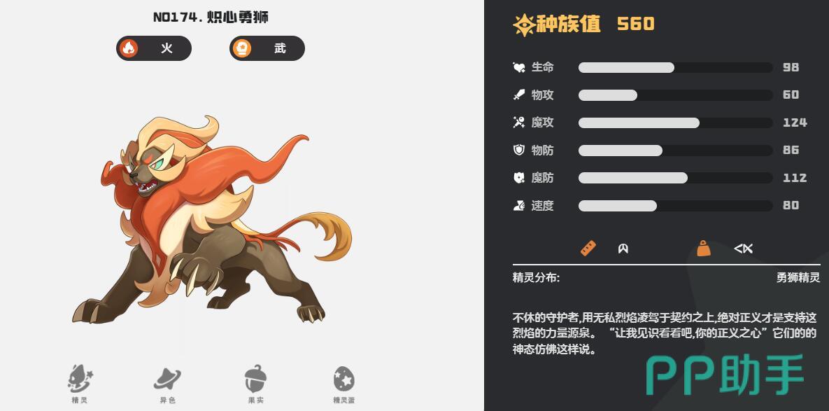 8.炽心勇狮:纯武系高爆发精灵,特性勇者之心血量越低伤害越高。技能烈焰冲锋附带灼烧效果,狮心怒可破除敌方增益。获取方式为挑战火山区域精英怪,推荐性格固执。