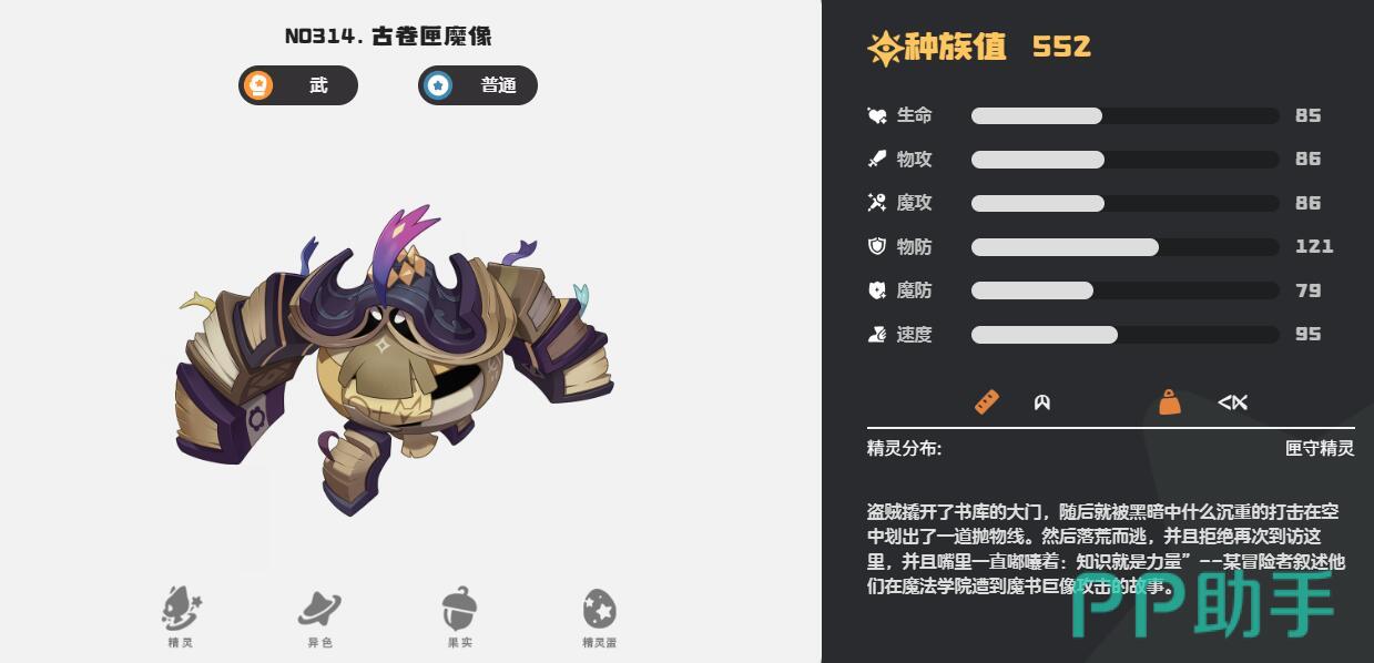 3.古卷匣魔像:武系与普通系精灵,特性勤学每回合提升少量物攻。技能书包重击造成高额伤害,课间休息回复生命值。推荐性格固执,参与学院日常任务获取。