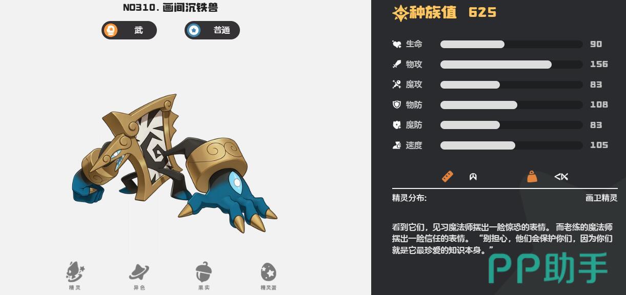 2.画间沉铁兽:作为武系与机械系双属性精灵,拥有独特的防御反击能力。技能铁壁重拳可在防御后发动强力反击,墨染冲击则能降低对手命中率。特性墨甲能减免30%远程伤害,推荐性格勇敢强化物攻。