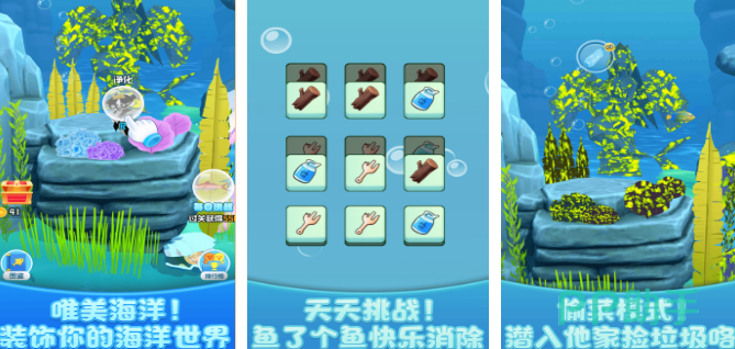在唯美的画风中,玩家将前往海洋世界进行快乐养鱼。在装饰方面,玩家可以选择不同颜色的海草以及其他植物来进行装饰,并且还会捕捉一些水母等生物来打造独特的海洋世界。在特色玩法中,玩家还可以通过消除的玩法与鱼类进行多种互动。除此之外,玩家还可以在偷菜模式中获得更多的快乐。