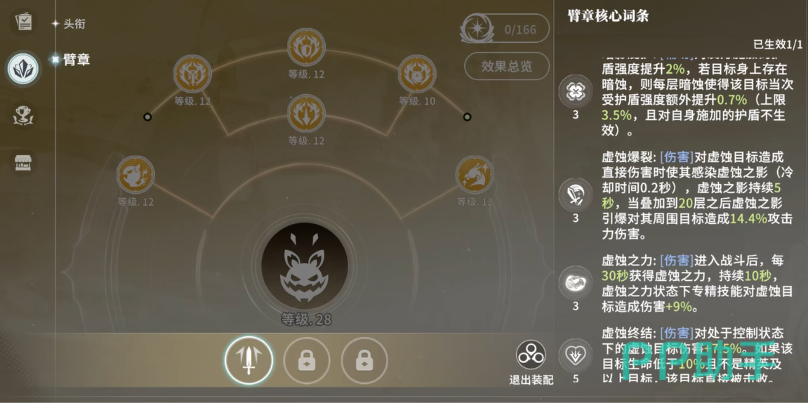 臂章等级达成之后,大家就可以自由选择探索技能。技能选择方面有伤害减免,如此一来就能够增加你的防御力,让你在塔塔或者刷副本时不至于被消灭得太快了。如果大家比较缺乏伤害的话,也可以选择增加侵蚀伤害的臂章效果。这样就可以对目标造成更高的伤害并引爆,造成范围性输出。