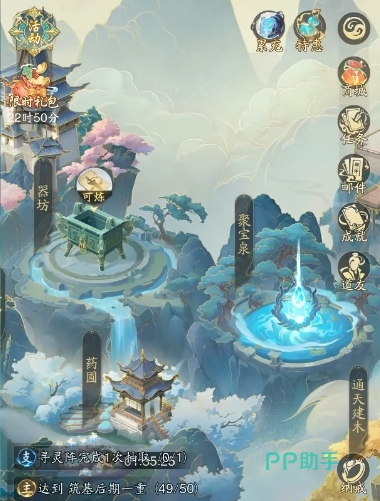 在洞府中玩家能搭建丹炉用于炼制丹药,不同的丹药能带来不同的修为提升效果;药园可以用来种植草药,种植成功后能直接投入丹炉中进行炼化;通天建木就是建造木材和灵石的模块,种植出来的木材和灵石可用于建筑升级;玉虚仙石这是炼制仙宝的地方,在角色装备上可以带仙宝、古宝等内容;储物阁也就是玩家的背包;聚宝泉是用于产出资源来抽取古器仙宝的;器灵阵这是用于解锁阵法栏位的;器坊用于打造珍惜装备的;凌霄渡口可通过搬运或者掠夺他人获得物资;御剑台就是用来炼制武器的。