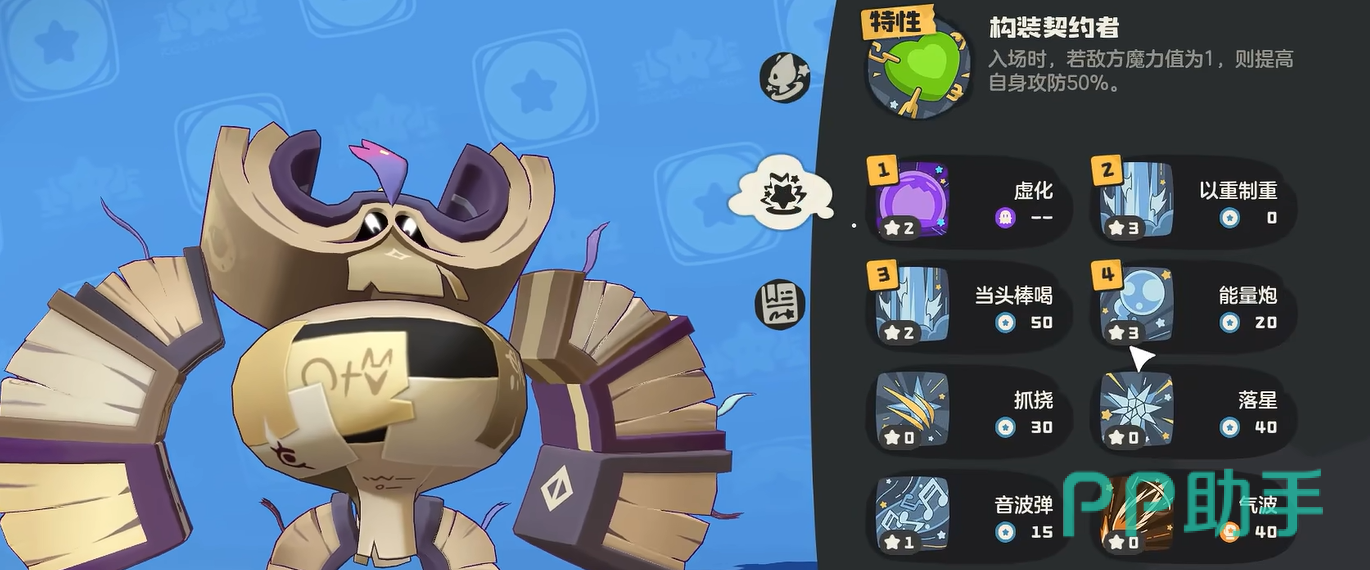 古卷匣魔像的特性叫做构装契约者,当战斗刚开始时,如果对手的魔力值仅为一的话,那就可以大幅度提高自身的攻击力以及防御力。所以大家最好将这个精灵作为后手使用,配招方面的话推荐虚化,由此就可以造成高额的暗属性伤害。