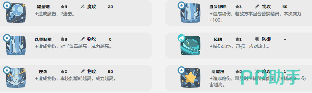 另外再搭配上以重制重,可以造成高额物理伤害,如果对方的体重越大的话,那就伤害越高。另外还可以搭配当头棒喝,要是对方本回合替换精灵的话,可以增加100点威力并造成物伤,瞬间摧毁对方的防线。再用能量炮的话,即可造成更多输出。