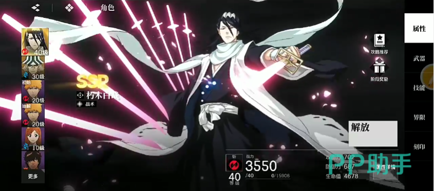 朽木白哉是原IP中非常经典的角色,同时在游戏里也是最高品质SSR,他的战斗能力是非常惊人的。首先是他的战场技千刃,战场技生效时,队伍中所有角色的伤害都会提高30%,会在除了他自己外的角色释放普攻分支,战技以及封灭反击后的两秒被激活,而且该招式可以使用的次数是非常多的,伤害也非常的可观;如果释放该技能后战场技的能量归零,他可以追加一次攻击,其效果等同于普攻的第四次。