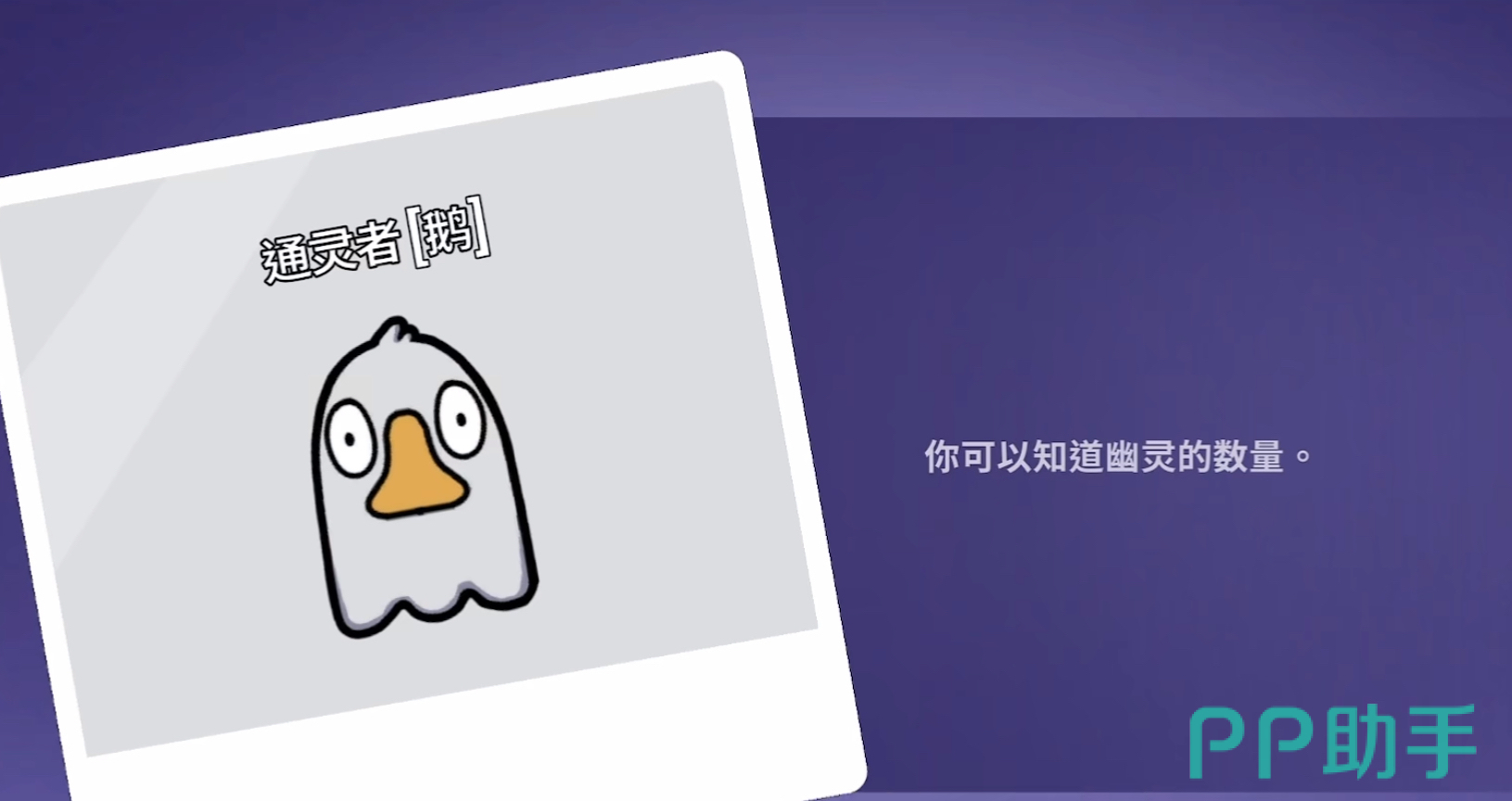通灵鹅:可以通过技能知道场上的死亡人数,即幽灵数量。通灵鹅的冷却时间为10秒,且被鹈鹕吃掉的玩家是不会被通灵鹅看到的。通灵鹅可以和侦探,加拿大鹅相互配合,缩小排查范围,提高好人的获胜几率。