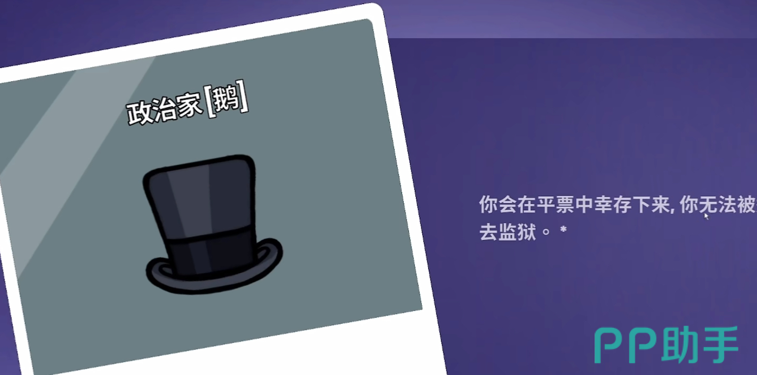 政治家:拥有免疫监狱和平票保护的能力,当告密者投票给政治家时,政治家可以不用进监狱。如果场上有和政治家平票的玩家,那么政治家不会被票出局。政治家只能自保,被动性太强,适合和好人抱团。