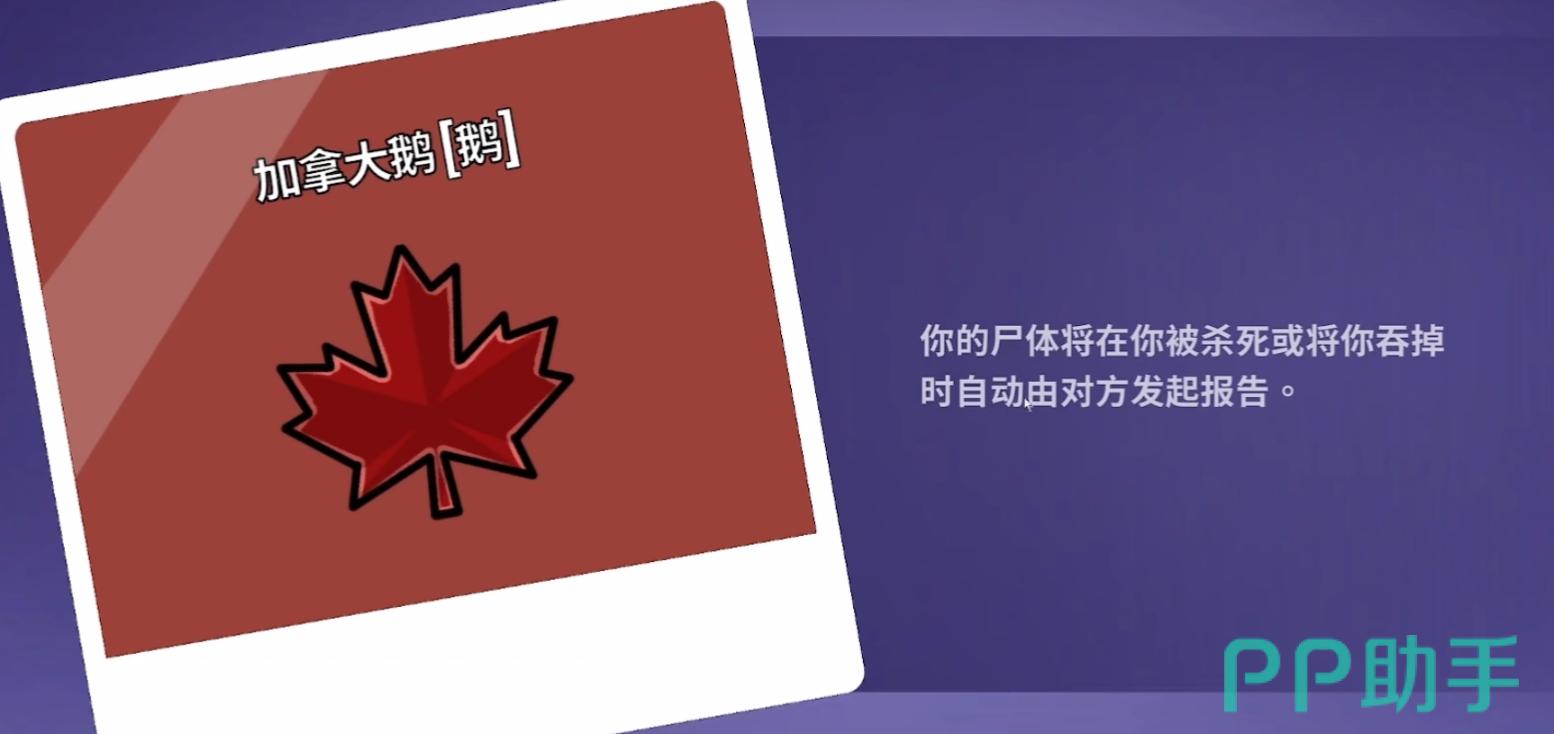 加拿大鹅:被刀之后1秒内自动报警,可以利用这点帮助好人阵营迅速找出凶手。但是加拿大鹅在被专业杀手杀掉之后是无法报警的,所以要格外注意。