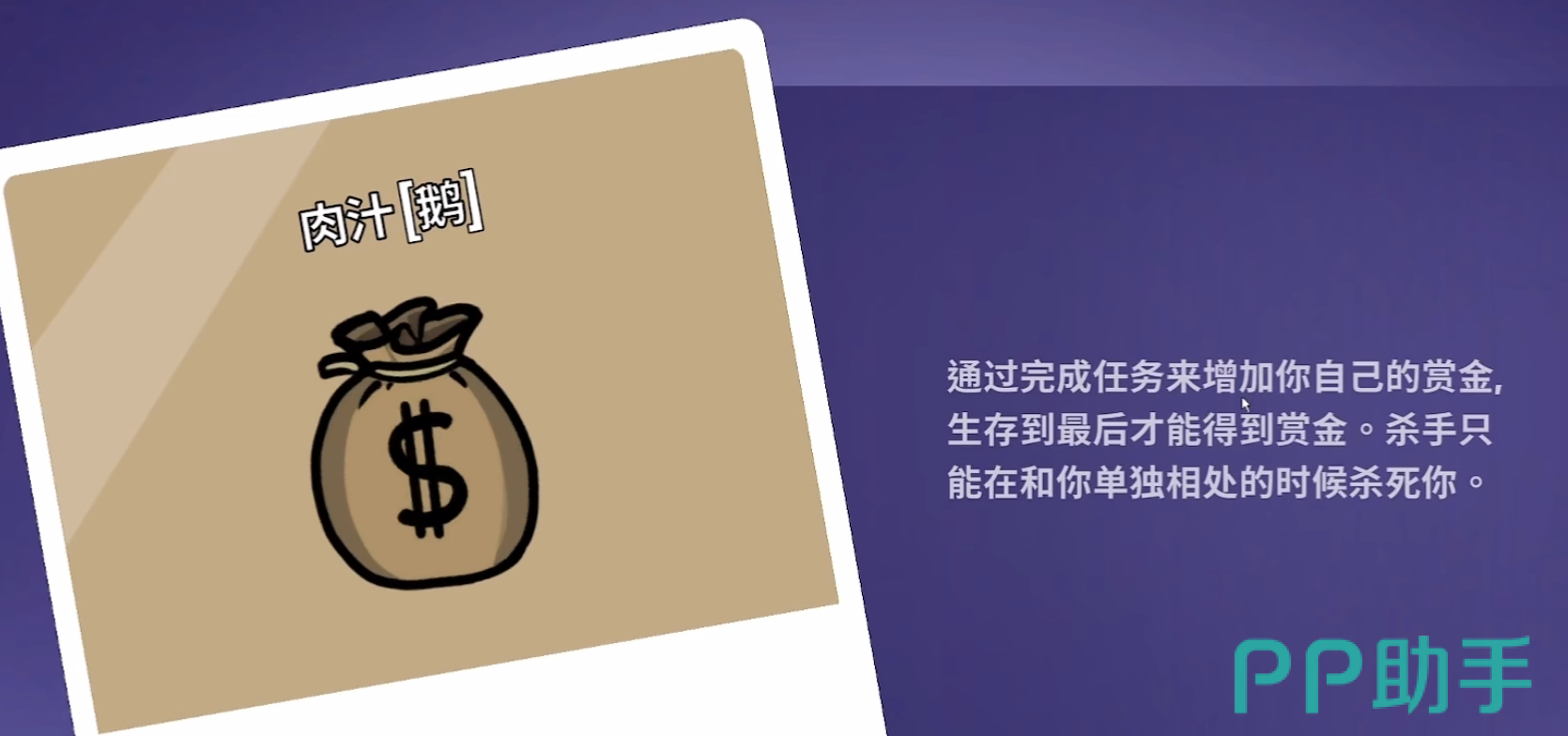 肉汁:肉汁能够通过完成任务来增加赏金,但是需要存活到最后才可以获得所有的赏金。肉汁在报团时可以免受刺杀,杀手只能在肉汁单独行动时才能刀。要注意的是,坏人阵营可以通过肉汁id旁边的钱袋子来判断身份,所以一定要报团行动,避免落单。