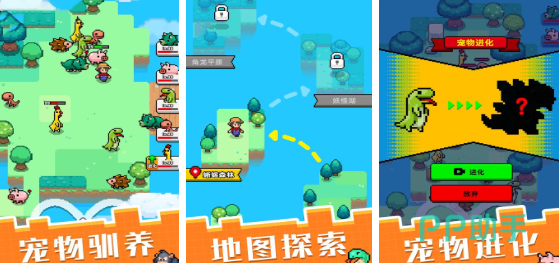 在像素画风下,玩家捕捉并且驯服精灵宠物。捕捉过程比较简单,玩家前往随机的地图进行探索,看到宠物后就可以利用道具进行捕捉。在宠物的进化方面,玩家可以将小恐龙等不同类型的精灵,通过按钮的方式进化成不同的物种。在后续的玩法中,玩家既可以在boss大战中脱颖而出,也可以选择通过交易收益翻倍。