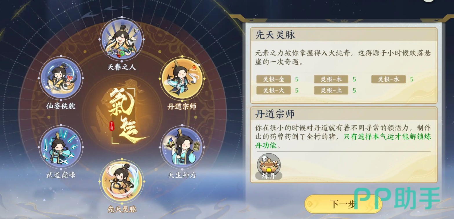 这里机缘属性是与爆率挂钩的,机缘属性越高有更大概率获得更好的奖励。还有人喜欢选丹道宗师,只有选这个气运才能解锁炼丹功能,丹药可以帮助大家在游戏中后期节省不少资源投入。