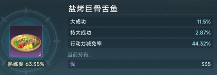 成品盐烤巨骨舌鱼可恢复120点行动力,是常规料理的3倍效果。战斗前使用可使舰队获得饱食状态,24小时内海战伤害提升8%。多余成品可挂海市交易,单价建议设定在4.5万-5万金币区间,注意每日交易税率为15%。保留3-5份用于紧急任务,如幽灵船讨伐或遗迹探索。