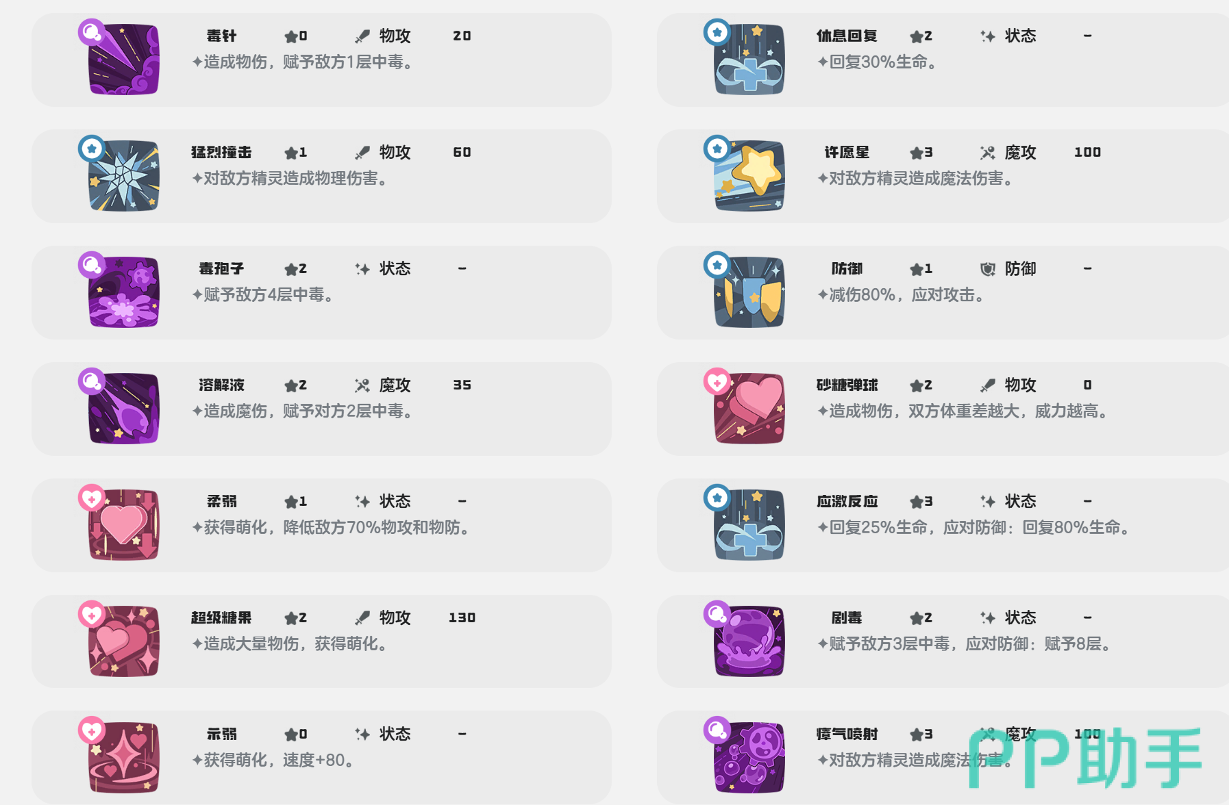 月亮坨分为上弦月和下弦月这两两种形态,而玩家合理的搭配技能组合,需要了解它的技能,其中核心技能毒孢子作为输出技能,可以搭配月亮驼的毒疗特性,让敌人的宠物中毒伤害加重。溶解液作为魔法攻击,附带中毒的效果,一旦施展之后可以降低敌人的魔防,可以让中毒的效果强加。