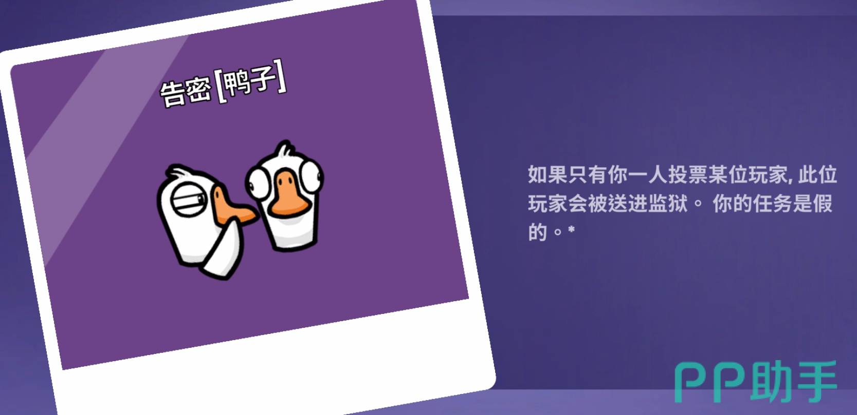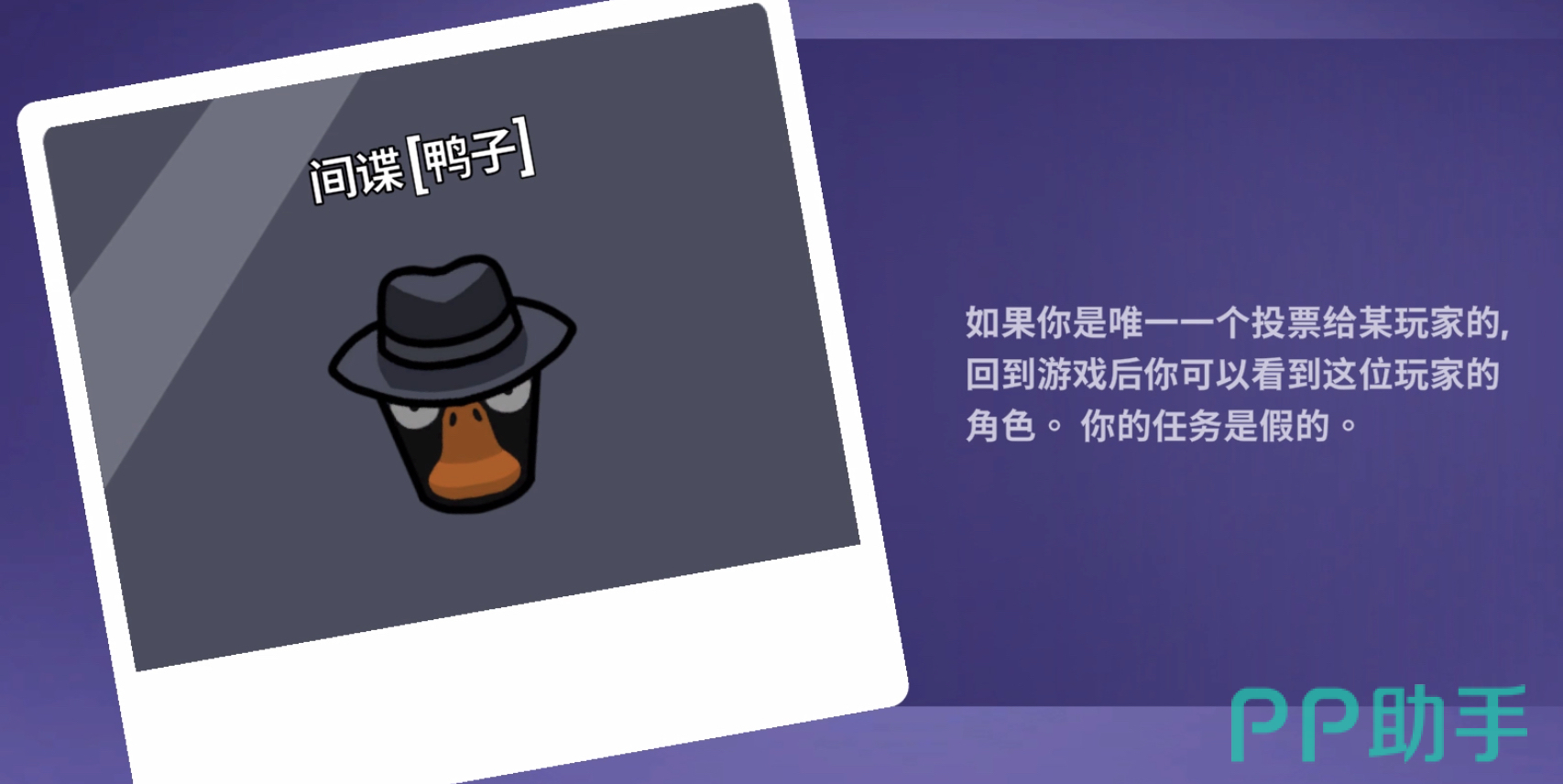 间谍鸭:在投票阶段,如果是自己唯一投票给某个玩家的,那么在回到游戏之后你就可以看到该位玩家的身份。可以用于查验身份,配合刺杀鸭完成点杀,当然也要注意隐藏。