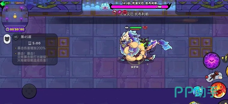在第45层,玩家会遇到的boss是荒漠灾厄.凯布利斯,作为一个火攻击的boss,他的血量高达30万,攻击为1000,移动速度为250,不要看他这么厉害但他的冰抗和雷抗仅有100,所以选择冰属性、雷属性的宠物角色是非常合适的,玩家可从此入手。
